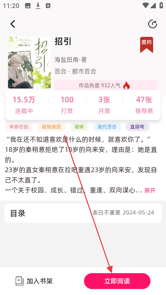 4、在小说详情页点击【立即阅读】,就能开始阅读《招引》,享受阅读乐趣啦。