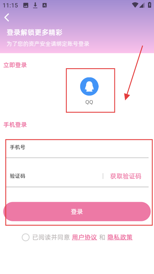 3、在登录页面,可选择QQ或手机验证码登录,按提示操作即可完成登录啦。