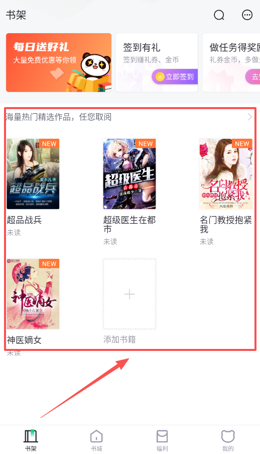 1、初次使用建议先熟悉书架页面布局,看到感兴趣的书籍直接点击即可阅读,添加书籍功能能帮你快速建立个人藏书库。