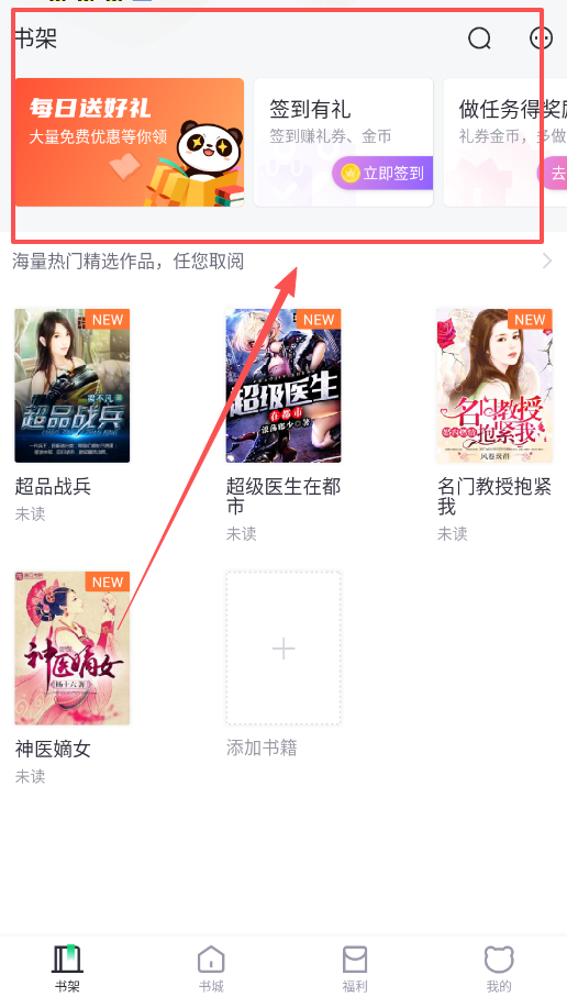 1、每天打开App先完成书架页的签到任务,积累的礼券能兑换更多书籍,通过添加书籍功能不断丰富个人收藏。