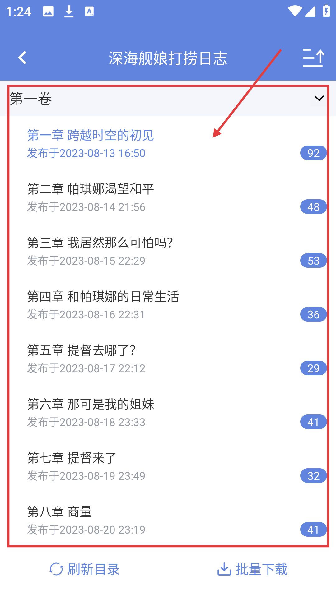 3、进入目录页,能看到各章节发布时间和阅读量,按需选择章节阅读呢。