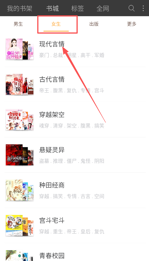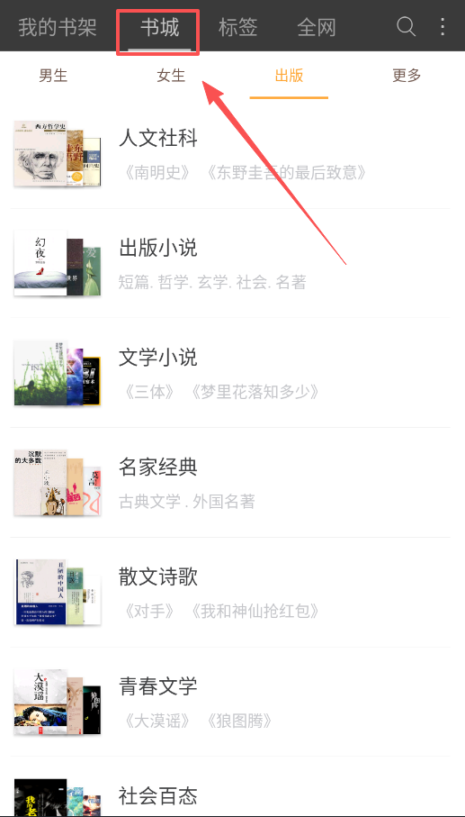 2、拿不准看什么的话,可以试试“书城”里的“男生”或“女生”频道,它把小说分成了玄幻、历史、官场等好懂的大类。