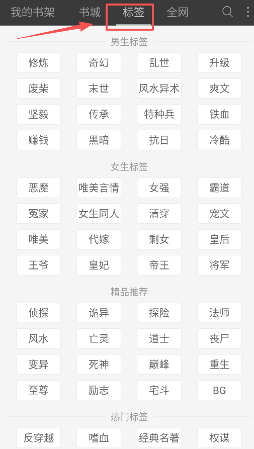 3、如果你有明确的喜好,比如就想看“爽文”或者“宠文”,那直接去“标签”页最省事,那里把所有口味都用关键词列出来了。