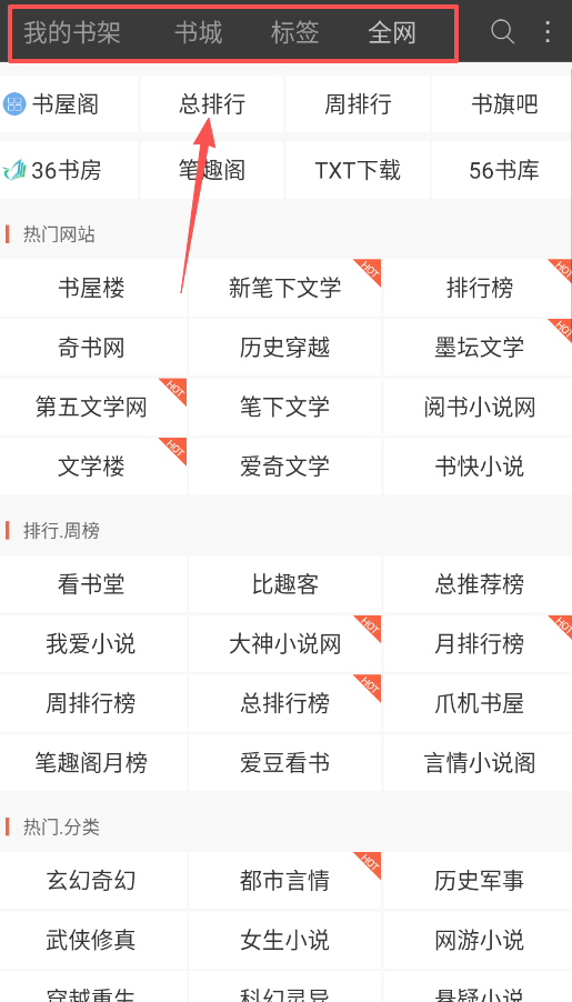 1、打开软件后,底部有“书城”和“标签”入口,书城里能看到“总排行”、“周排行”等榜单,还有“书屋阁”、“36书房”等热门网站。