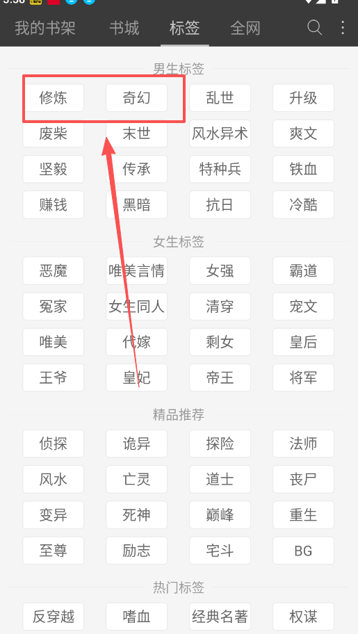 3、切换到“标签”页,这里标签更详细,男生标签有修炼、奇幻、爽文等,女生标签有女强、宠文、清穿等,还有精品推荐和热门标签。