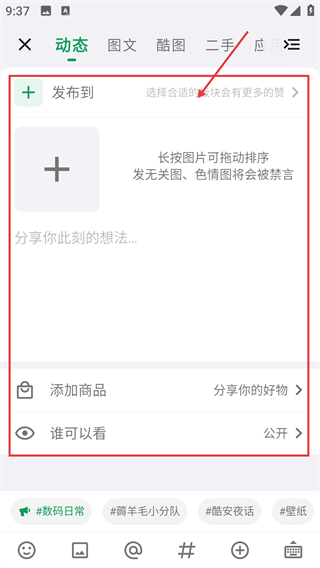 1、在首页点击底部的【+】按钮,就能进入内容发布界面,准备分享自己的动态啦。