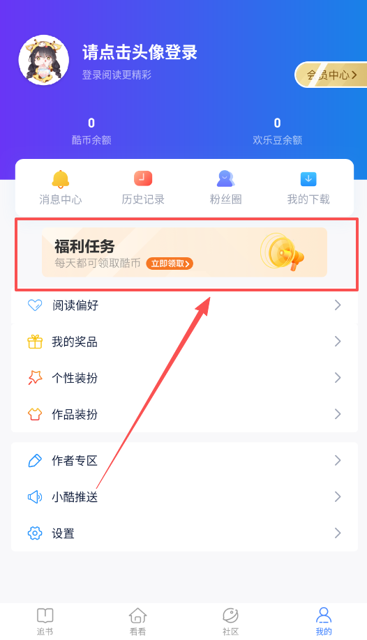 4、福利任务区每天可以领取酷币,在会员中心能查看历史记录和粉丝圈,记得常回来做任务领奖励。