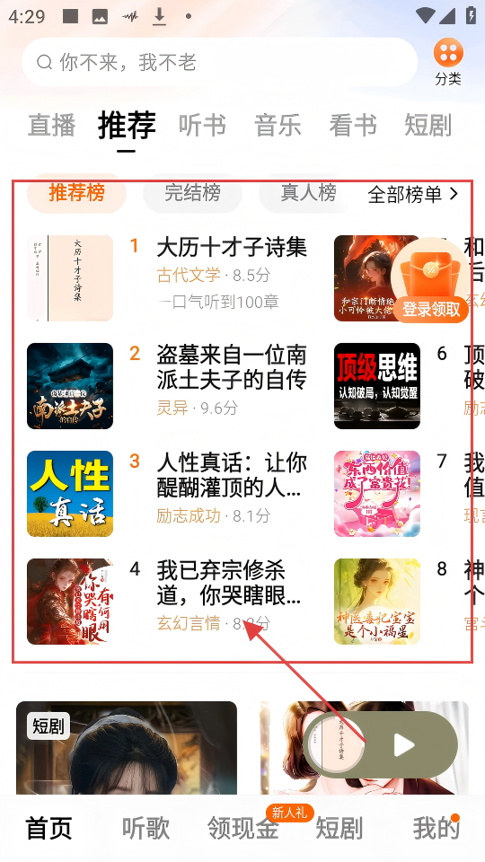 1、在首页推荐榜单里,挑选感兴趣的内容点击进入。