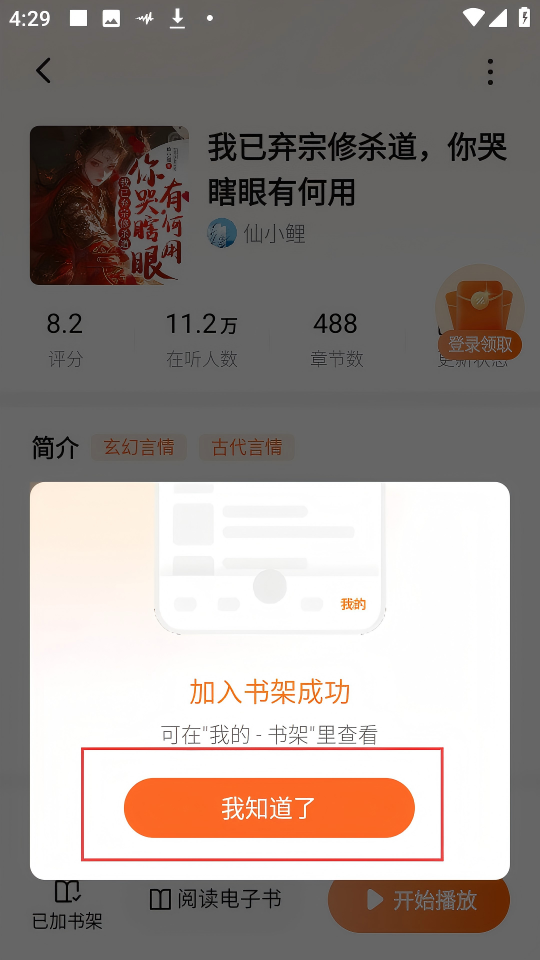 3、点击【加书架】后,会弹出【加入书架成功】提示框,点击【我知道了】关闭提示框即可。