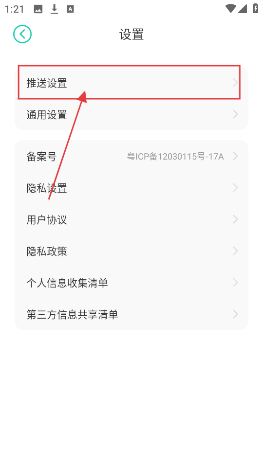 2、进入设置页面后,点击【推送设置】,就能管理消息推送相关的选项,快试试吧。