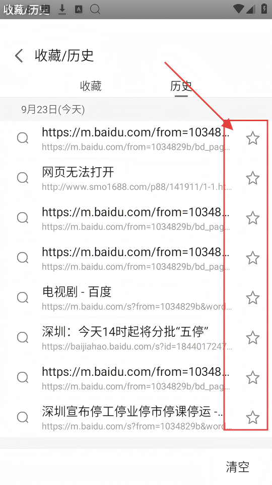 3、进入【收藏/历史】的历史页面,能看到多条历史记录,每条记录旁有星星图标,可进行收藏操作啦。