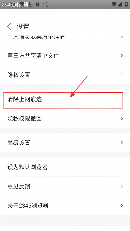 3、在设置页面,找到【清除上网痕迹】选项并点击,能进入清除痕迹相关界面,管理上网痕迹啦。