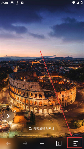 1、在浏览器界面,点击底部三横线菜单按钮,可展开功能选项,准备开启无痕浏览模式啦。