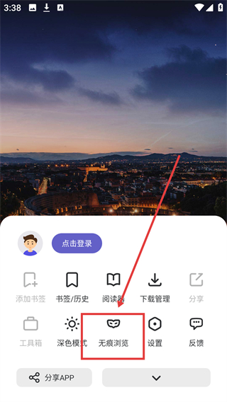 2、展开菜单后,点击【无痕浏览】,可进入无痕浏览状态哦。