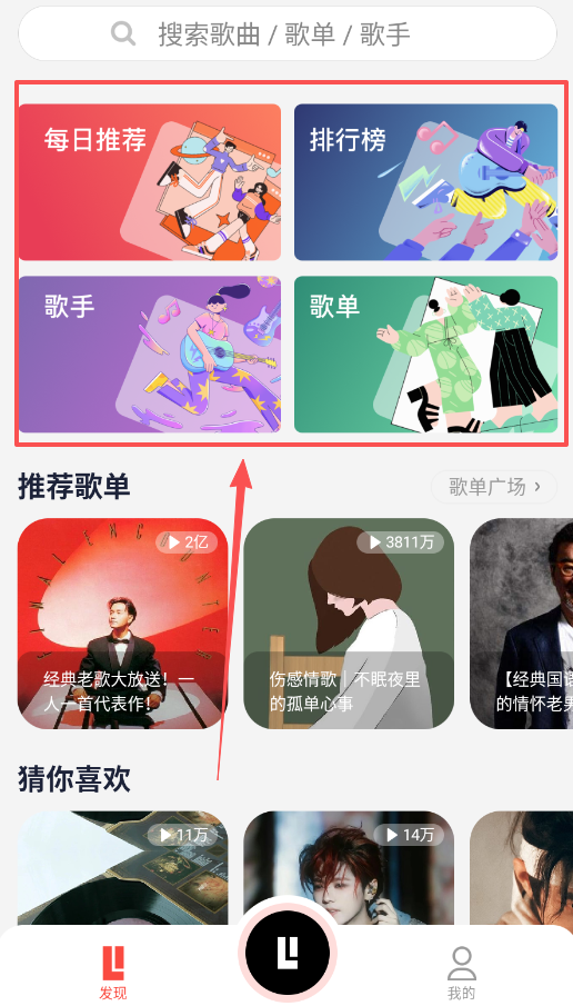 2、探索音乐内容主要靠“发现”页,这里的“推荐歌单”和“猜你喜欢”是系统为你量身定制的,多听听有助于算法更懂你的口味。