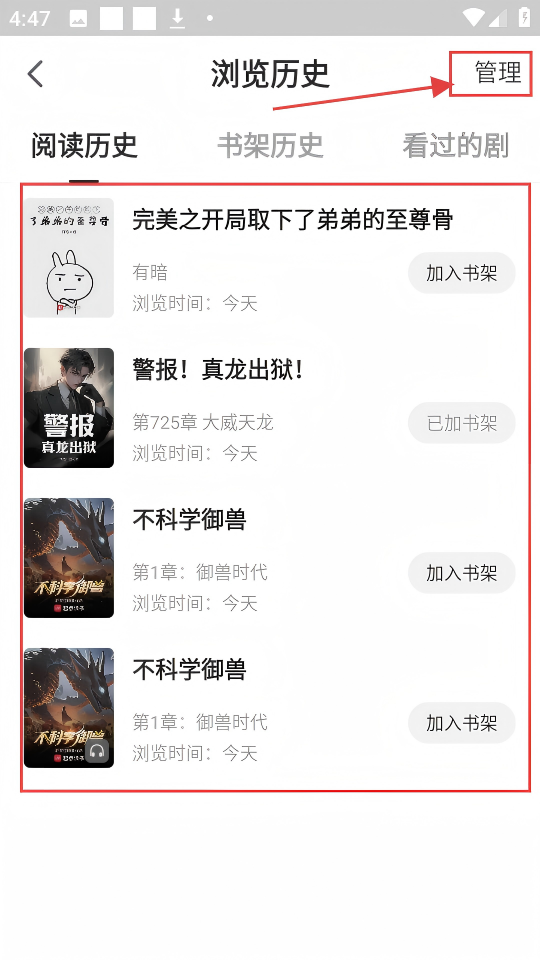 3、进入浏览历史页面,点击【管理】,就能对浏览记录进行管理操作,超实用。