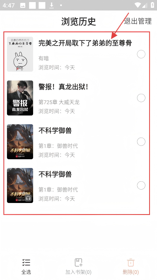 4、进入管理状态后,可勾选要操作的浏览记录,进行删除等操作,整理记录超轻松。