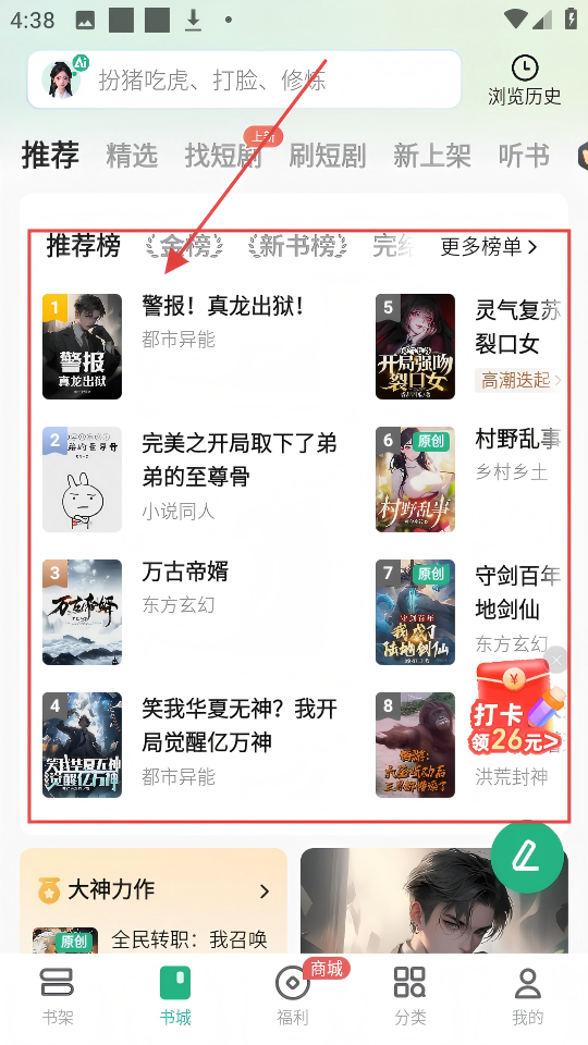 1、在书城推荐榜里,有超多热门小说,找到感兴趣的,点击就能进入小说详情页,超赞。