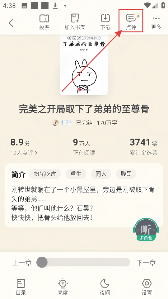 2、在小说详情页,点击【点评】,能看到其他读者的评价,了解小说口碑超方便。