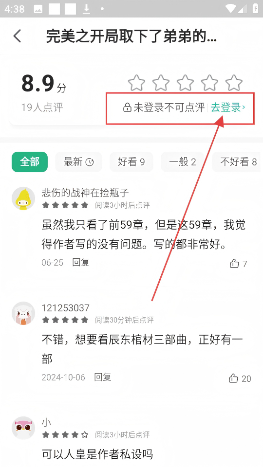 3、若想点评小说,看到【未登录不可点评-去登录】提示,点击去登录,就能参与点评啦。