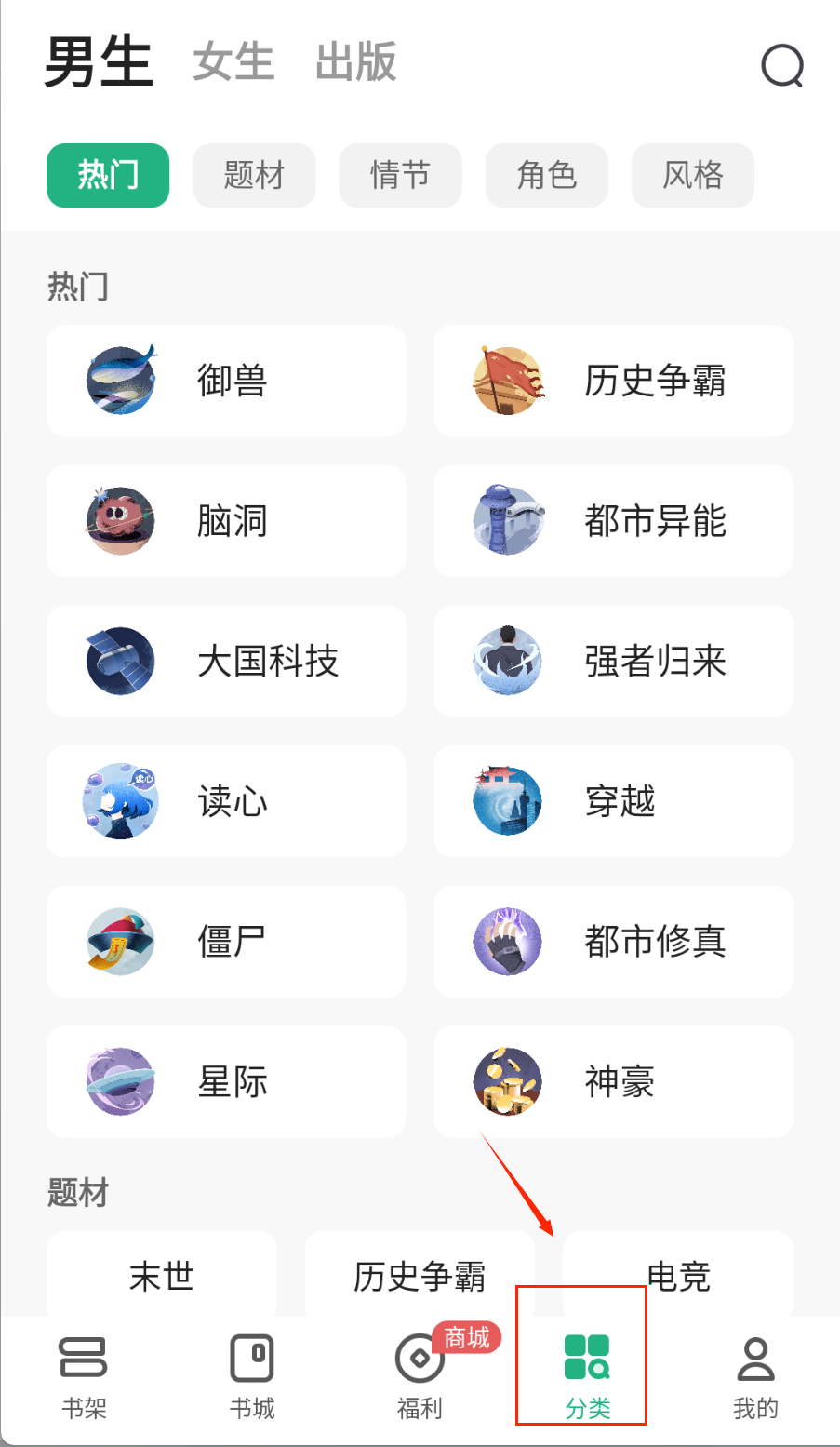 3、找书时活用分类筛选器,在“分类”界面选择性别频道后,再点选题材标签如僵尸、星际、末世等,能快速缩小范围找到心头好哦。