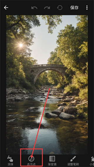 2、进入编辑页后,选择底部的【去污点】功能,切换到污点修复模式,准备处理图片中的瑕疵区域哦。