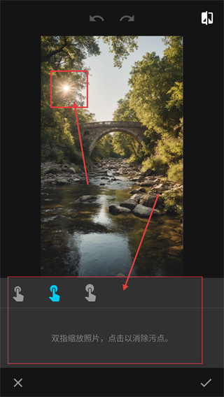 3、根据提示双指缩放照片,定位到污点处点击,即可消除对应瑕疵,让画面更干净整洁呀。