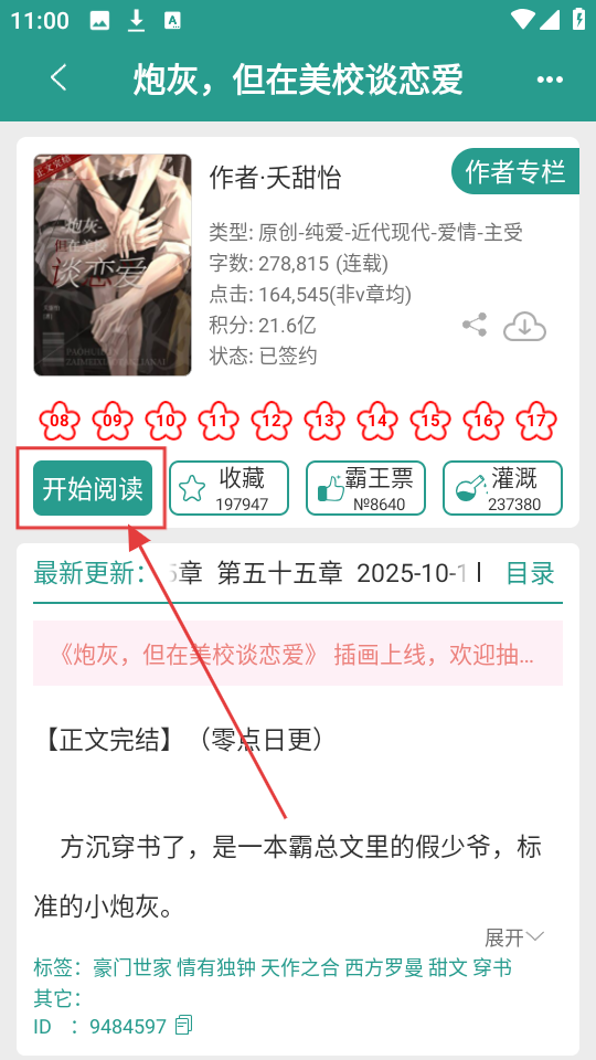 1、打开APP书城页面,选择想看的小说,比如【炮灰,但在美校谈恋爱】,进入小说详情页面,准备听书啦。