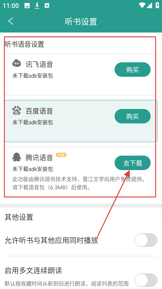 4、在听书设置页面,选择合适的听书语音,如腾讯语音,点击【去下载】按钮,下载后即可使用该语音听书啦。