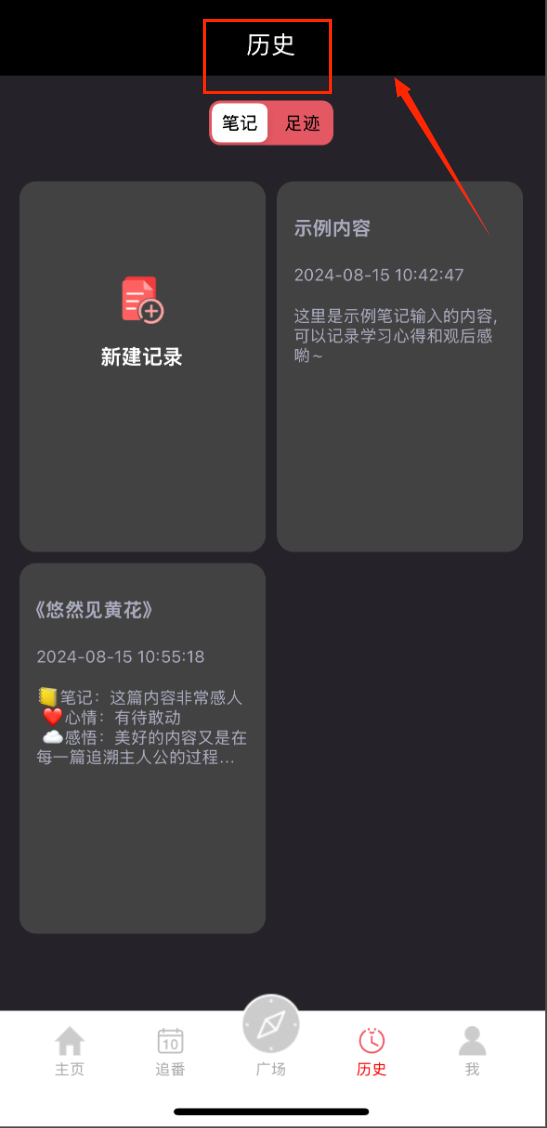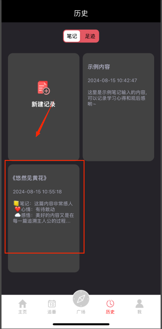 1、在历史页面选择笔记标签,可以查看所有阅读笔记,系统会显示记录时间和内容概要。