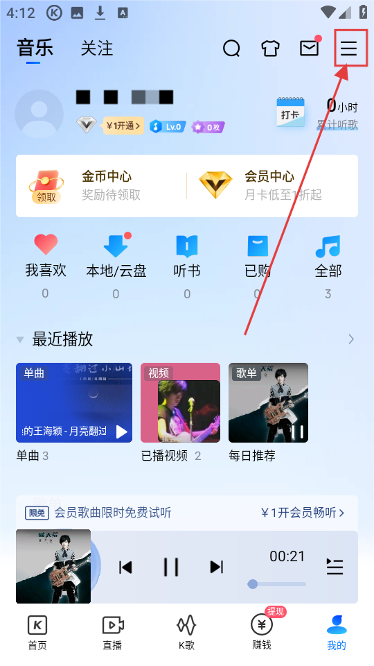 2、接着前往酷狗音乐app【我的】页面中点击右上角的扩展小图标(下图红色箭头所指)