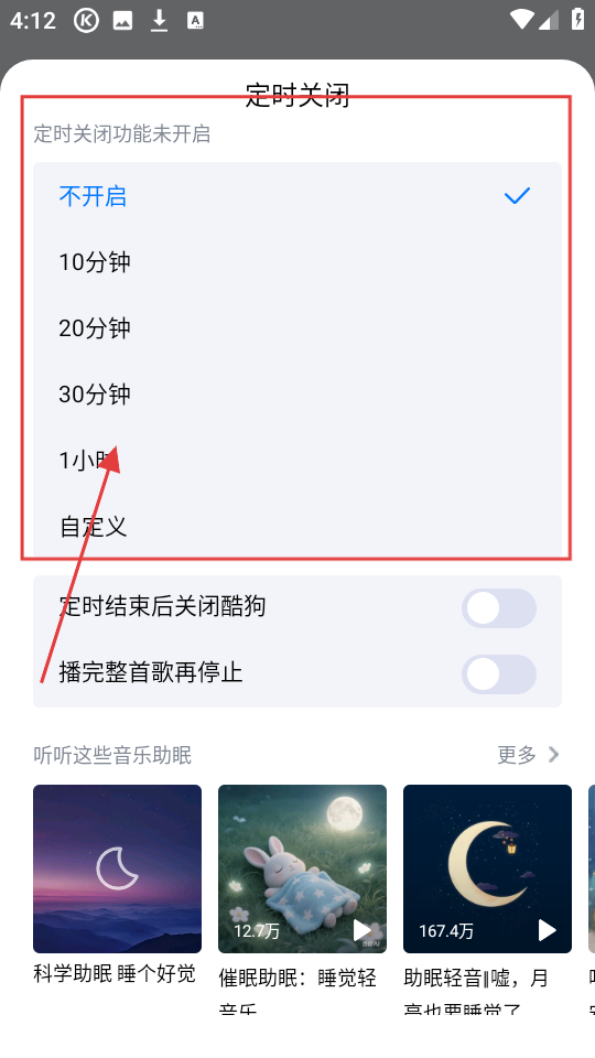 3、在定时关闭设置页面,可选择不同的定时时长,如10分钟、20分钟等,这里选择【30分钟】。