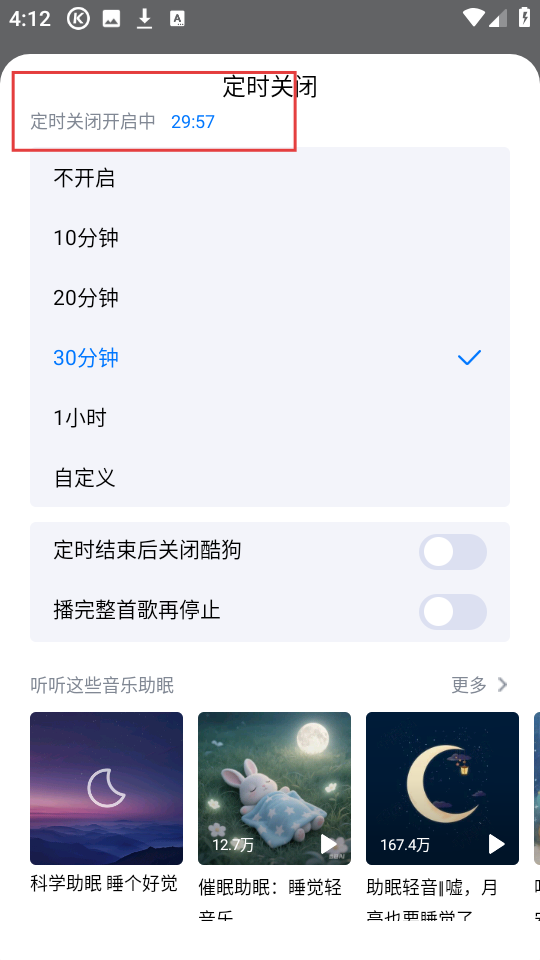 4、选择好30分钟后,定时关闭功能开启,页面显示剩余时间,到时间后音乐将自动关闭啦。