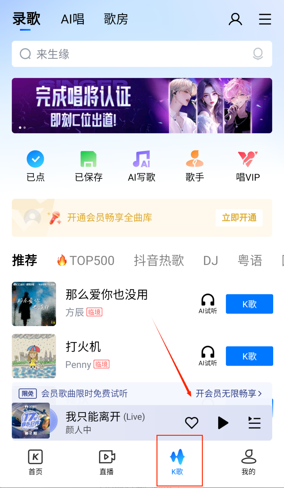 3、K歌功能很有趣,点击底部“K歌”进入录歌界面,这里有“已点”“已保存”等分类,还能使用“AI写歌”创作独特作品,唱完可以分享给好友哦。