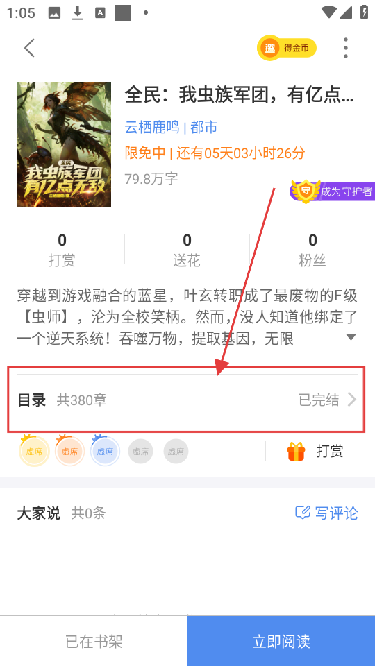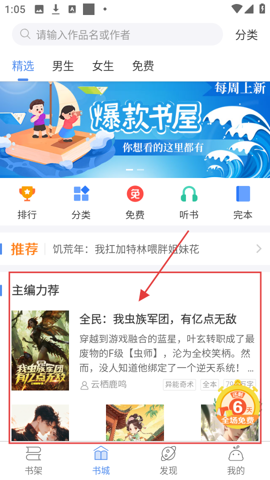 1、在书城页面,点击主编力荐的书籍,如《全民:我虫族军团,有亿点无敌》,可进入书籍详情页啦。