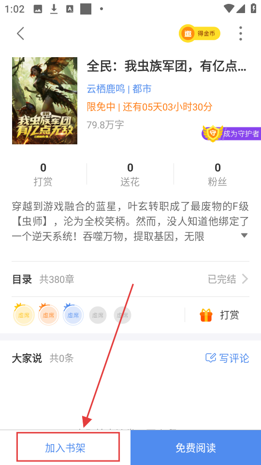 2、进入小说详情页,点击【加入书架】按钮,可将小说加入书架方便后续阅读啦。
