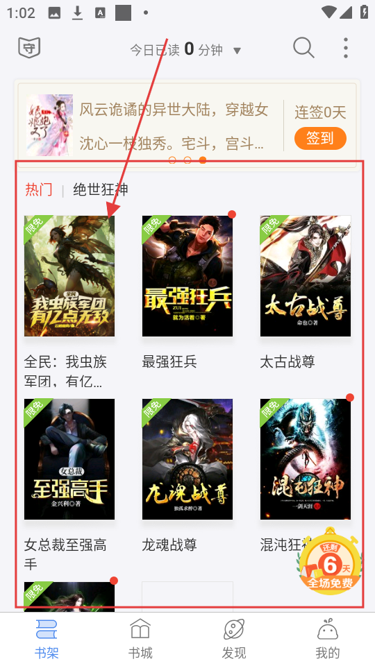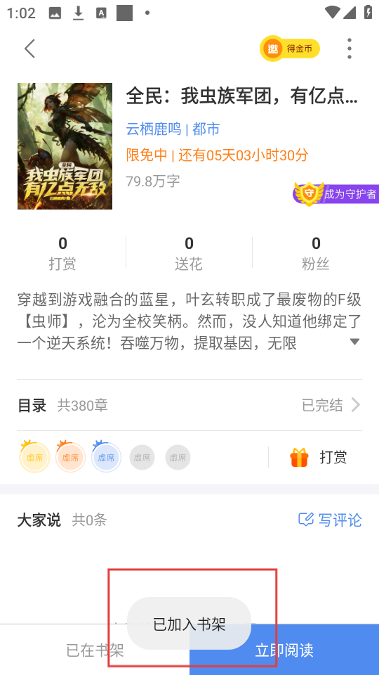 4、切换到书架页面,可看到已加入书架的小说,比如《全民:我虫族军团,有亿点无敌》,点击即可阅读哦。