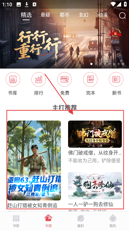 1、在书城页面,有主打推荐的小说,点击感兴趣的小说可进入小说详情页,开启阅读之旅哦。