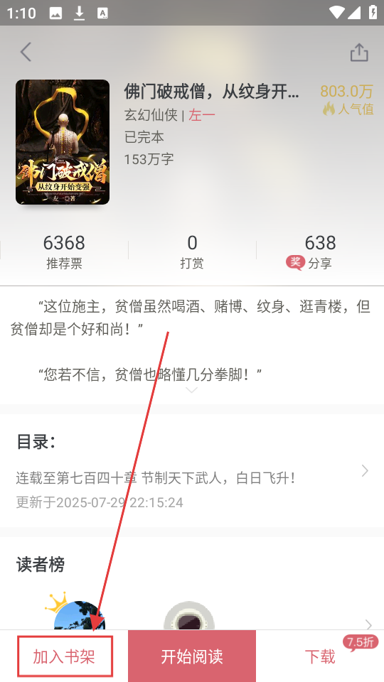 2、进入小说详情页后,点击【加入书架】按钮,可将小说加入书架,方便后续阅读啦。