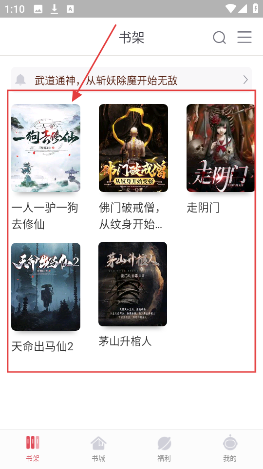 3、进入书架页面,可看到已加入书架的小说列表,点击可继续阅读哦。