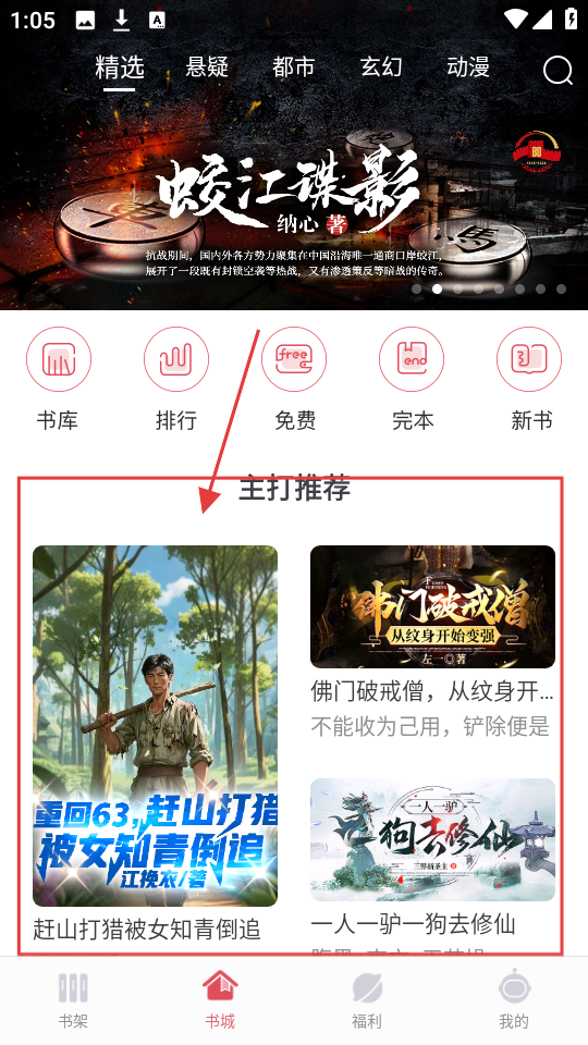 1、打开APP的书城页面,在主打推荐中选择目标小说,点击进入小说详情页啦。
