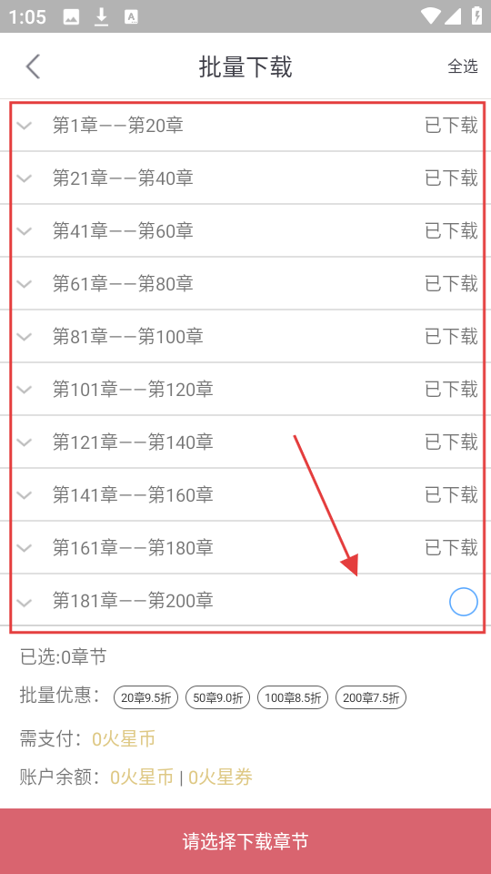 3、在批量下载页面,选择要下载的章节,比如【第181章--第200章】,勾选对应的章节呢。