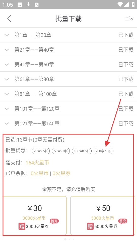4、选择批量优惠后,若火星币余额不足,可充值后购买,完成小说章节下载啦。