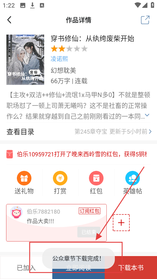 4、下载完成后,页面将显示【公众章节下载完成】提示,说明书籍下载成功,可随时阅读哦。