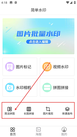 1、在软件的首页,点击【简洁拼图】功能按钮,就能进入拼图编辑页面,开始组合图片啦。