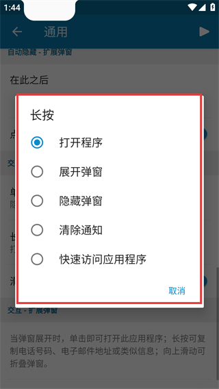4、点击【长按】选项后,弹出红框标注的操作选择弹窗,可选择打开程序、展开弹窗、隐藏弹窗、清除通知、快速访问应用程序,点击【取消】。