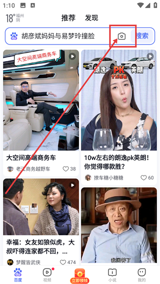 1、在百度APP首页,点击搜索框右侧的相机图标,即可进入拍照搜索相关功能界面,准备进行识图操作啦。