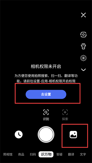 2、进入相机功能界面后,若提示相机权限未开启,点击【去设置】按钮,可跳转至权限设置页开启权限,也能点击图片图标选择本地图片哦。