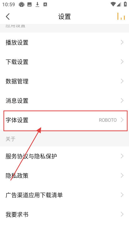 3、在设置页面,有播放设置、字体设置等选项,点击【字体设置】,就能进入字体设置页面呢。