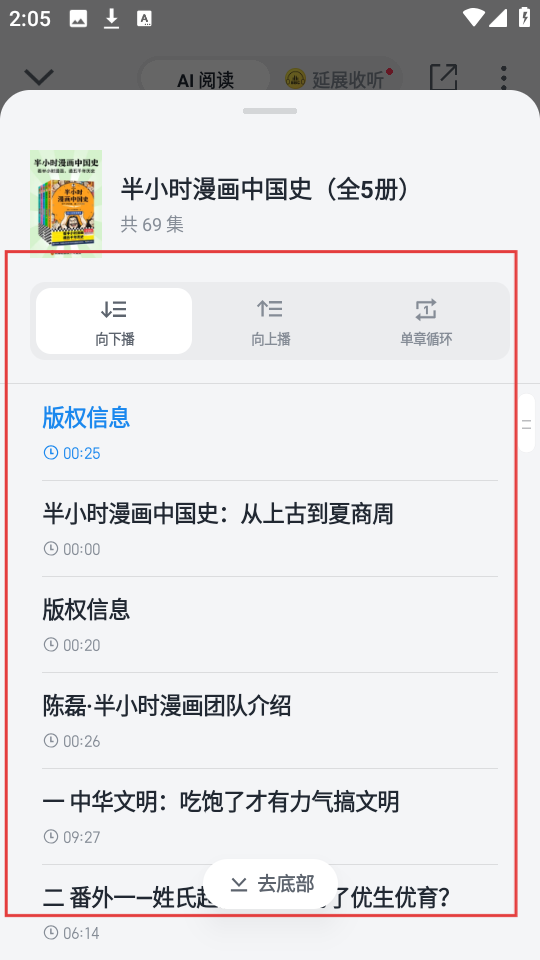 4、点击集数,可查看有声书的章节列表,选择章节收听哦。